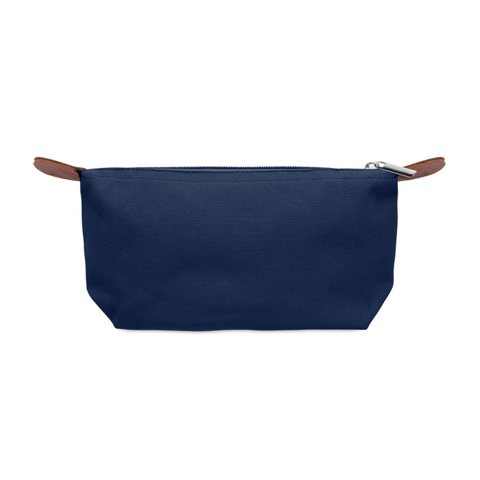600D RPET-polyesteriä oleva kosmetiikkalaukku, jossa vetoketjukiinnitys ja ruskeat PU-yksityiskohdat.