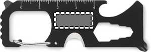 Ruostumattomasta teräksestä valmistettu monitoimityökalu taskukokoisena. 8 toimintoa. Sisältää: hammassaha, lankaleikkuri, jakoavain, Phillips-ruuvimeisseli, urainen ruuvimeisseli, mitta-asteikko, pullonavaaja ja avaimenperä.