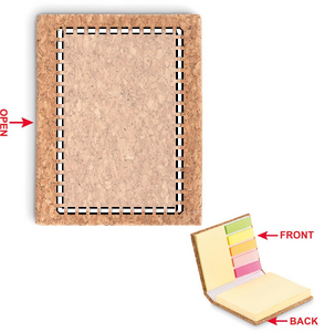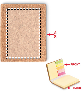 Muistilappuvihko kovalla korkki kannella, 50 iso ja 25 keskikokoista tarrapintaista muistilappua, 5 eri väristä indeksi tarralappua. Korkki on luonnonmateriaali, strukturaalinen laatu ja pinnan huokoisuus voi aiheuttaa eroavaisuuksia tuotteissa painatuksen jälkeen