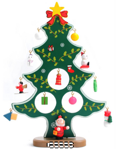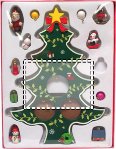 Puinen joulukoriste joulupuun muodossa, 12 erillistä pientä koristetta. Tuote on itse koottava ja pakattuna lahjapakkaukseen.